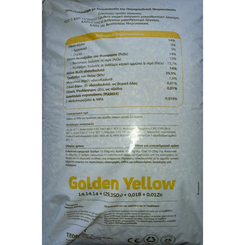 ΛΙΠΑΣΜΑ 14-14-14+1,5Mgο+Zn+B+S (SOP) PIAMAX GOLDEN YELLOW TEOFERT 25kg