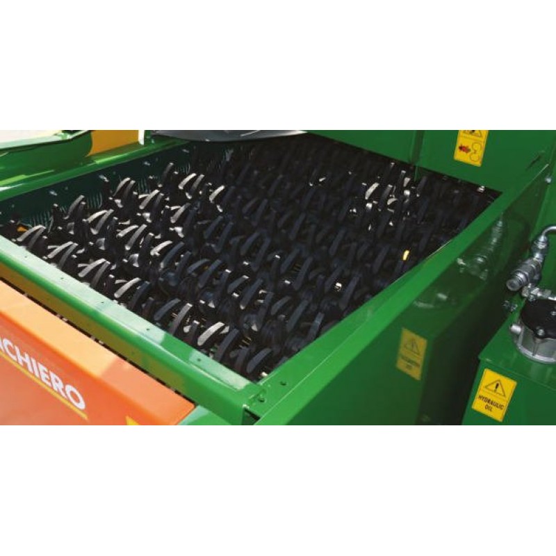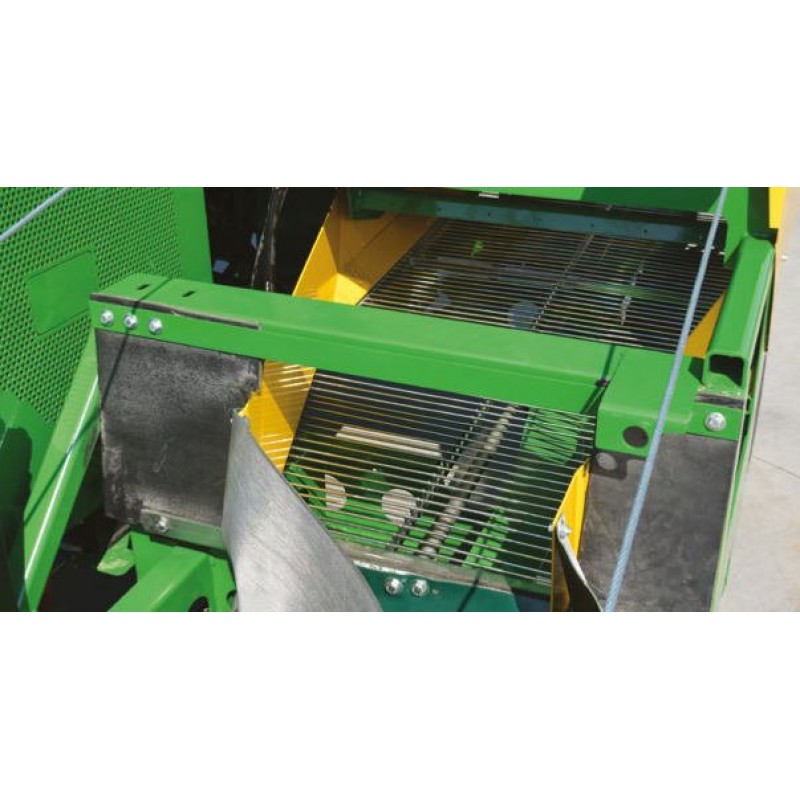 Ο ιμάντας εκκένωσης χοάνης 2800 λίτρων με ανεμιστήρα για τον καθαρισμό των φύλλων και την απομάκρυνση των υπολειμμάτων έχει ρυθμιζόμενη ταχύτητα, όπως και το μεγάλο τελικό κόσκινο για την απομάκρυνση των υπολειμμάτων και των λεπτών υπολειμμάτων και ο διαχωριστής με ρολό για κλαδιά και πέτρες.