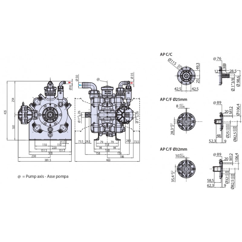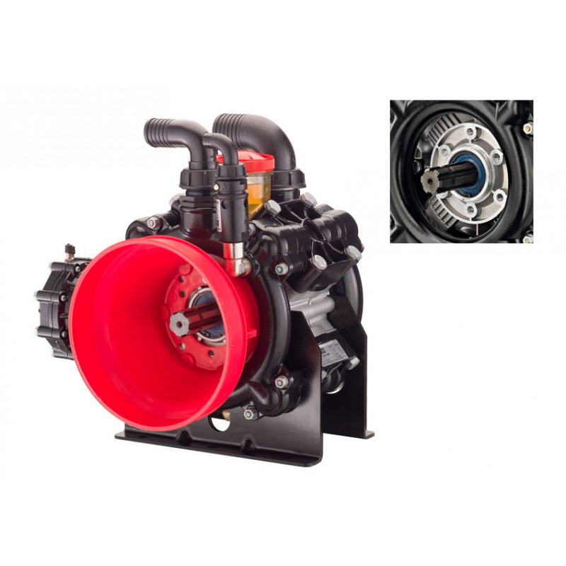 Ημιυδραυλική αντλία τεσσάρων διαφραγμάτων, για χρήση σε συστήματα χαμηλής πίεσης. Μέρη σε επαφή με αντλούμενα υγρά από αλουμίνιο Rilsan με πλαστική επίστρωση και AISI 303/304. Διαφράγματα σε NBR. Σφραγίδες σε NBR. Χυτό περίβλημα με μηχανισμό βυθισμένο στο λάδι και διαφανές πλαστικό δοχείο για οπτικό έλεγχο στάθμης. Εξοπλισμένο με αεροϋδραυλικό αποσβεστήρα για ομαλότερη λειτουργία και λιγότερο εφέ σφυριού στο κύκλωμα παροχής. Αισθητήρας απομακρυσμένης παρακολούθησης στάθμης κατόπιν αιτήματος. Κιτ εγκατάστασης απομακρυσμένης δεξαμενής λαδιού διαθέσιμο κατόπιν αιτήματος. Πώμα αποστράγγισης λαδιού. Έμβολα με δακτύλιο για πιο αποτελεσματικό σύστημα «μαξιλαριού λαδιού» για προστασία του διαφράγματος. Βαλβίδες προφίλ σφαιρικού τομέα για χαμηλότερη αντίσταση ροής και βελτιωμένη ογκομετρική απόδοση. Ανθεκτικά πόδια στερεωμένα στο περίβλημα της αντλίας. Μαζικής παραγωγής βαλβίδα ασφαλείας και προστασία από κάρδανο. Μεταλλικοί συνδετήρες Geomet. Διαθέσιμα εξαρτήματα τροχαλίας, φλάντζες για υδραυλικούς κινητήρες και υδραυλικές αντλίες για υπερβολικά γρανάζια. Κιτ για το συνδυασμό δύο αντλιών για το σχηματισμό μιας αρθρωτής μονάδας για την παροχή των διαφόρων χρήσεων του ψεκαστήρα.