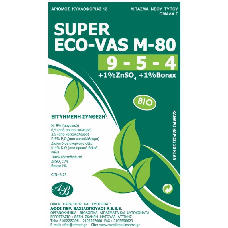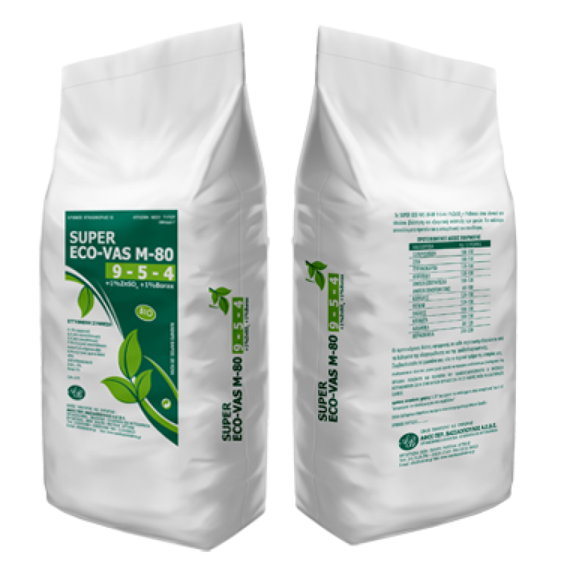 Τα λιπάσματα νέου τύπου SUPER ECO-VAS απλά και σύνθετα, αποτελούν τη λύση στις ανάγκες της θρέψης στη βιολογική γεωργία γιατί περιέχουν τις ιδανικές αναλογίες N-P-K, ιχνοστοιχείων, οργανικής ύλης και μικροοργανισμών στις εκλεκτότερες μορφές τους. Η βραδεία απελευθέρωση των θρεπτικών στοιχείων συμβάλλει στο συνεχή εφοδιασμό του εδάφους για μεγάλο διάστημα κατά τη διάρκεια της καλλιεργητικής περιόδου. Το άζωτο της οργανικής ουσίας δεν υπάρχει σε τοξικές συγκεντρώσεις και δεν χάνεται με έκπλυση ενώ η βραδεία απελευθέρωση του επηρεάζει ευνοϊκά τη διαθεσιμότητα των άλλων θρεπτικών.