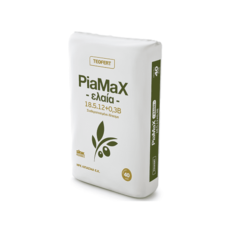 PIAMAX ΕΛΑΙΑ 18-5-12+0,3B 25kg Κοκκώδες Λίπασμα Ελιάς - Λιπάσματα Ελαιοκαλλιέργειας. Λίπασμα εμπλουτισμένο με Βόριο, κατάλληλο για την θρέψη της ελιάς. Προσφέρει παρατεταμένη τροφοδότηση αζώτου στα ελαιόδεντρα σύμφωνα με τις ανάγκες τους, καθώς περιέχει 18 μονάδες αζώτου, σταθεροποιημένες στον κόκκο με 2 παρεμποδιστές νιτροποίησης PiaMax: την Μεθυλοπυραζόλη (3-Methyl Pyrazol - Μethyl Pyrazol) και την 1H-2,3,4 Τριαζόλη (Triazole) της γερμανικής εταιρείας SKW-Piesteritz. Ακόμα, παρουσιάζει υψηλή διαλυτότητα Φωσφόρου, ενώ διαθέτει τις ορθές ποσότητες Βορίου (σε άμεσα απορροφήσιμη μορφή από τα φυτά) και Θείου (8,5%S - για την αύξηση της σύνθεσης των ελαίων). Παρέχεται σε συσκευασία των 25kg.