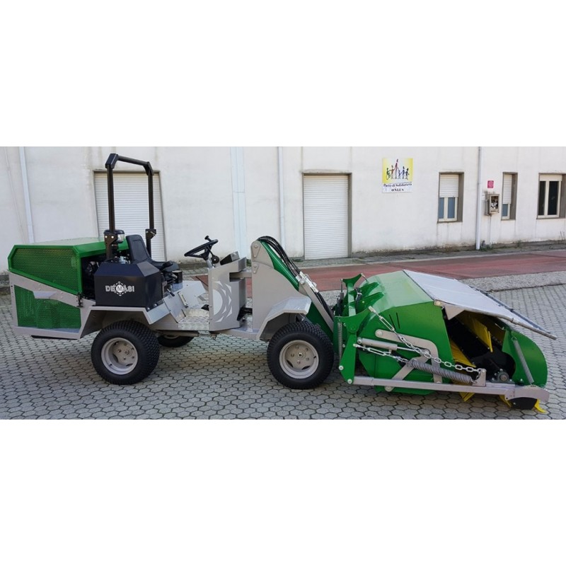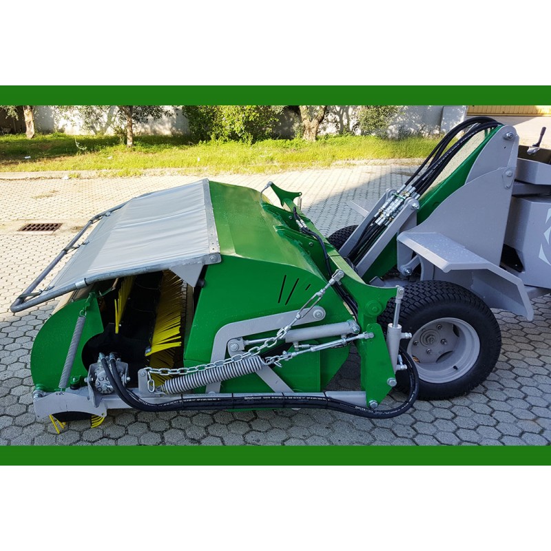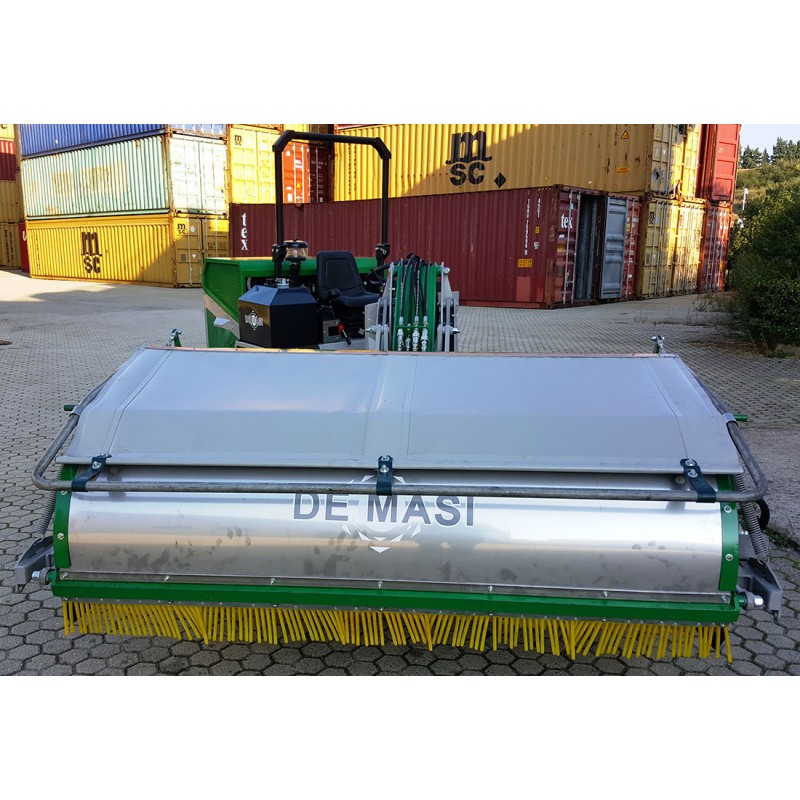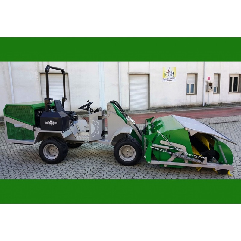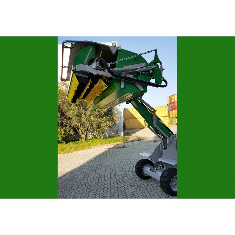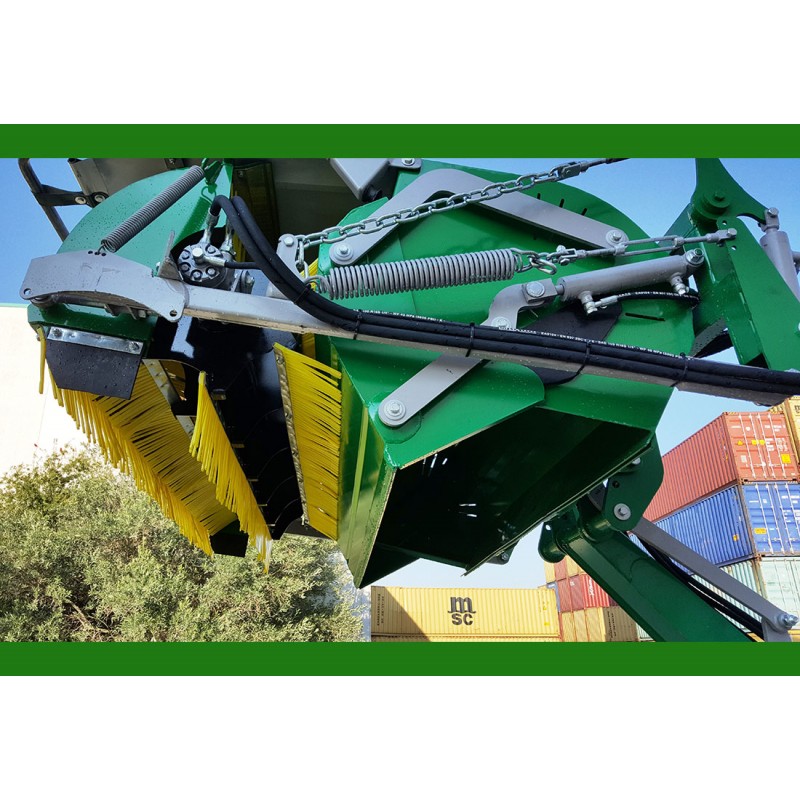 Συσκευή για τη συλλογή ελιών, αμυγδάλων, φουντουκιών, καρυδιών κλπ., Με πλάτος εργασίας cm. 180, με πατενταρισμένο σύστημα ισοπέδωσης στο έδαφος. Περιστρεφόμενο κιβώτιο 0,40 mc, σύστημα εκφόρτωσης προϊόντων με υδραυλική θύρα χαμηλής πόρτας, αφαιρούμενα πόδια στήριξης.