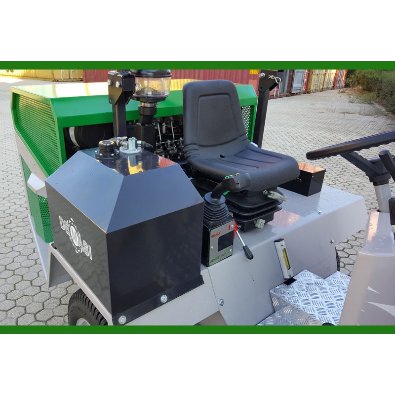 Υδραυλικά χειριστήρια τροφοδοσίας και εργασίας με ηλεκτροϋδραυλικό χειριστήριο, με συσκευή ασφαλείας για τον άνθρωπο. Κεντρική υδραυλική δεξαμενή με δείκτη στάθμης, lt 60. Ενοποιημένος εναλλάκτης θερμότητας νερού πετρελαίου. Δεξαμενή καυσίμου 48 λίτρων, κάθισμα οδηγού με πολυθρόνα, αντιολισθητική πλάκα αλουμινίου, πίνακας ελέγχου με ταχύμετρο, φίλτρο απόφραξης συναγερμού, ηχητικό. Υδραυλική πέδηση με χειροκίνητο έλεγχο. Κινητήρας ISUZU 4 κυλίνδρων από cc 2.179, Kw 35,2 cv. 47,8, με ψύξη με νερό, με ενιαίο ψύκτη λαδιού, τοποθετημένο σε αντικραδασμικές βάσεις.